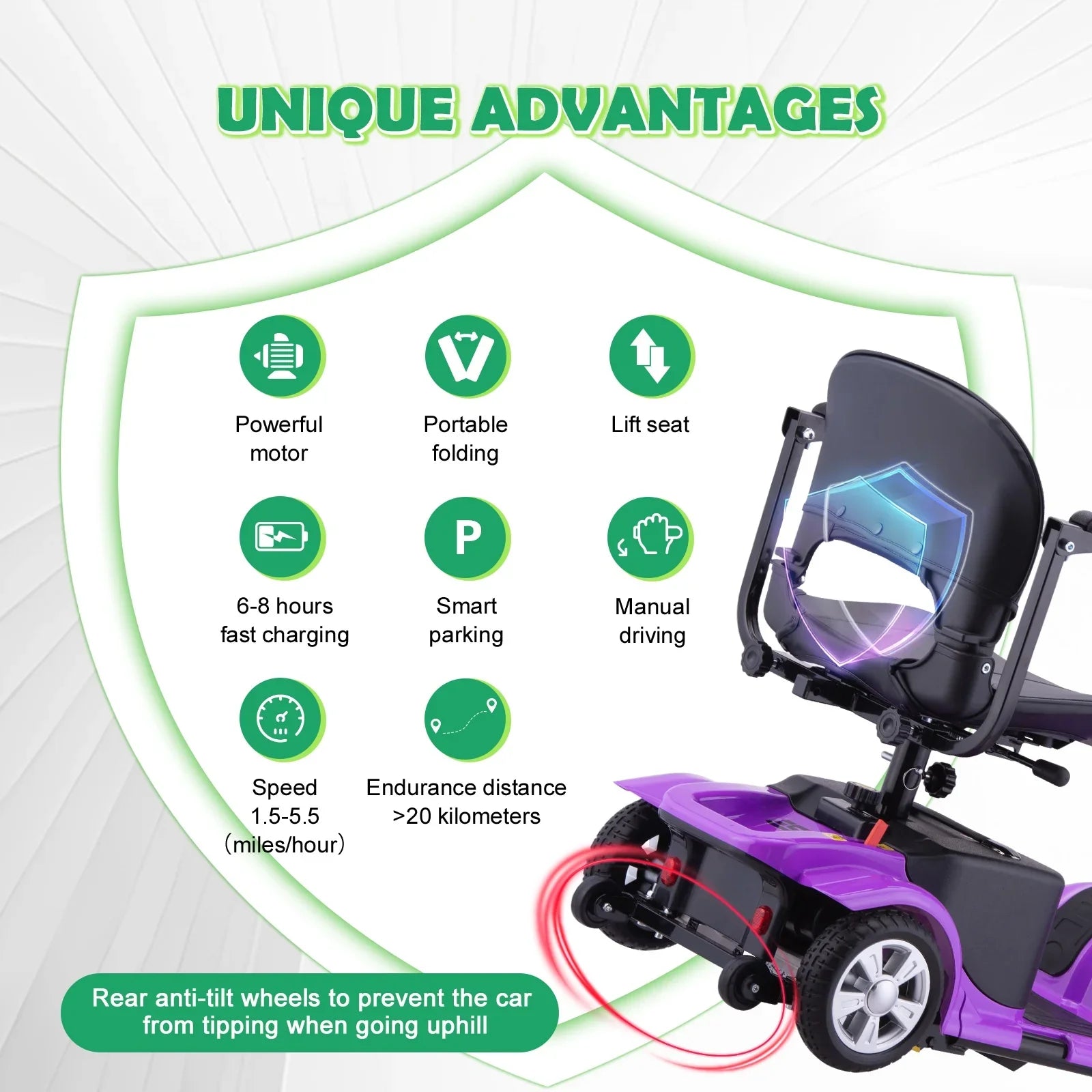 4 Wheels Mobility Scooter for Adults, Senior Electric Powered Chargeable Device for Travel, Lightweight and Portable, with LED Headlights and Basket, Charger Included (PURPLE)
