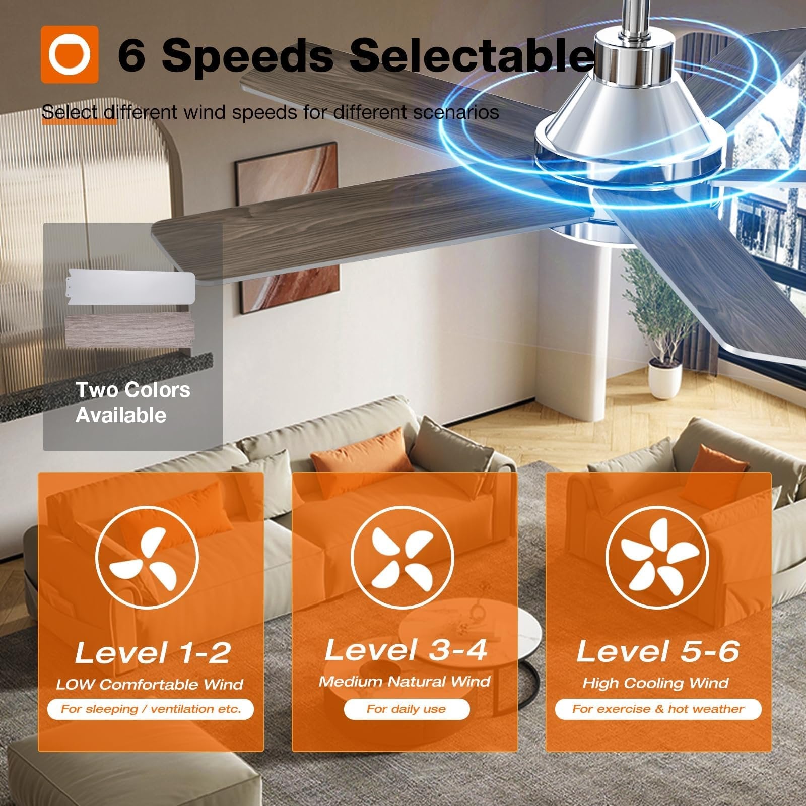 High-quality high-speed motor brings a perfect wind experience. The wind speed can be adjusted in multiple gears, you can choose from comfortable wind, natural wind and strong wind. The reversible two-way fan improves air circulation, keeping you warm in winter and cool in summer. Our fans are available in two colors, simple and atmospheric, for you to choose the fan blade color that best suits your home decoration!Depending on your needs for the space, the light output you need may be different. If you spend a cozy night, you may need less light, while activities such as family game night or homework time may require more. Our smart ceiling fan with light is dimmable (10%-100%), allowing you to find the ideal light for various occasions.