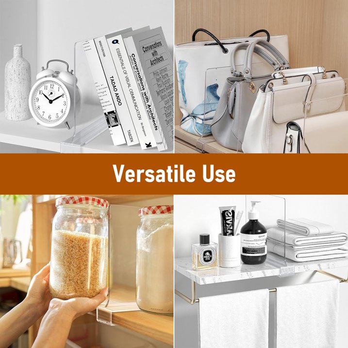 - Maximize Your Closet Space: These acrylic shelf dividers are perfect for organizing and separating shoes, towels, jeans, sweaters, baseball caps, yoga pants, activewear, blankets, handbags, books, and more! Keep your closet, pantry, or any shelving space neat and clutter-free with ease.