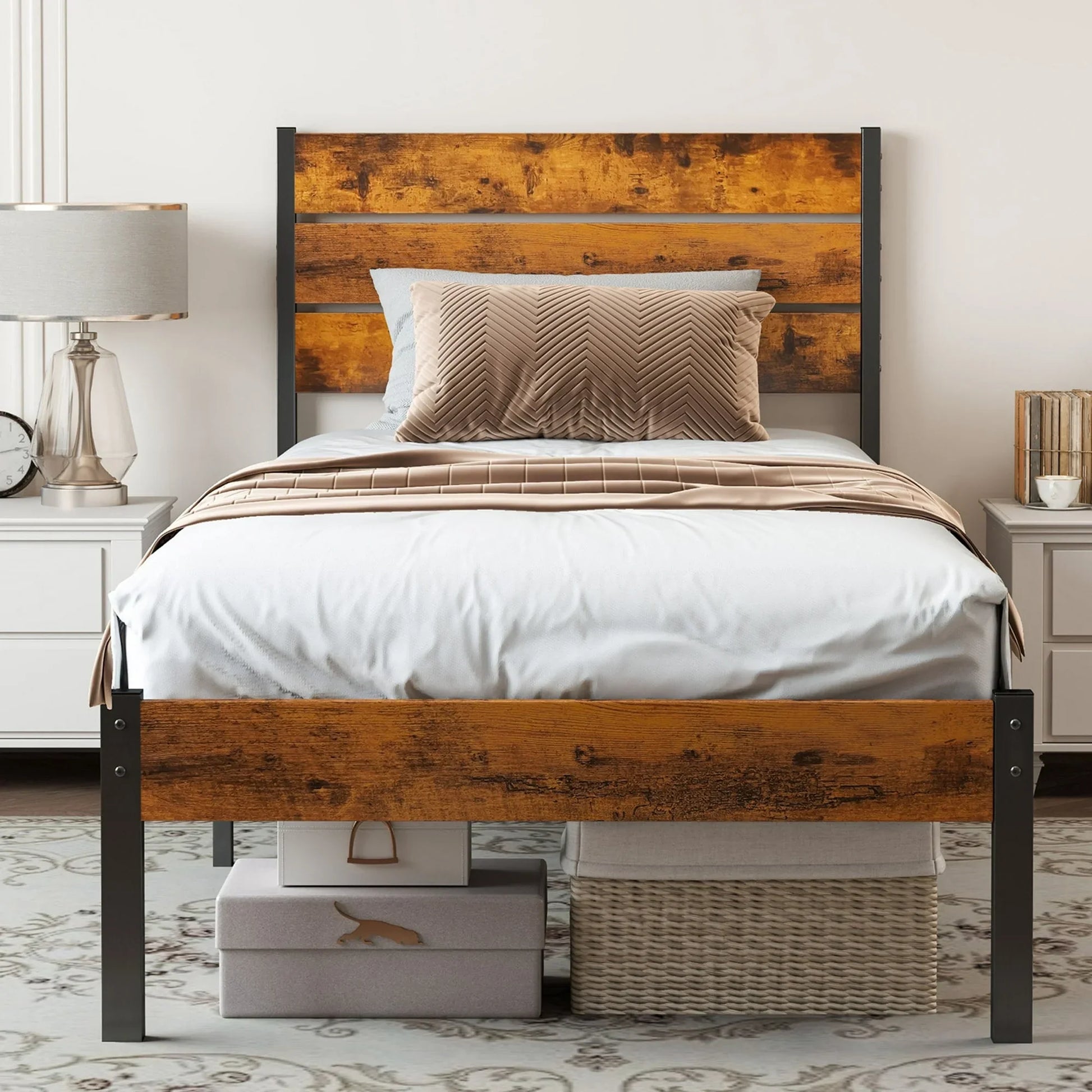 EDX Twin Size Metal Bed Frame with Industrial Wooden Headboard, Ample Storage, Noise-Free Design, Sturdy Steel Slat Support, Rustic Brown