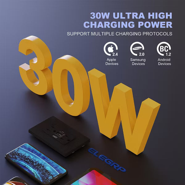 ELEGRP 30-Watt 15 Amp 3-Port Type C and Dual Type A USB Duplex USB Wall Outlet, Wall Plate Included