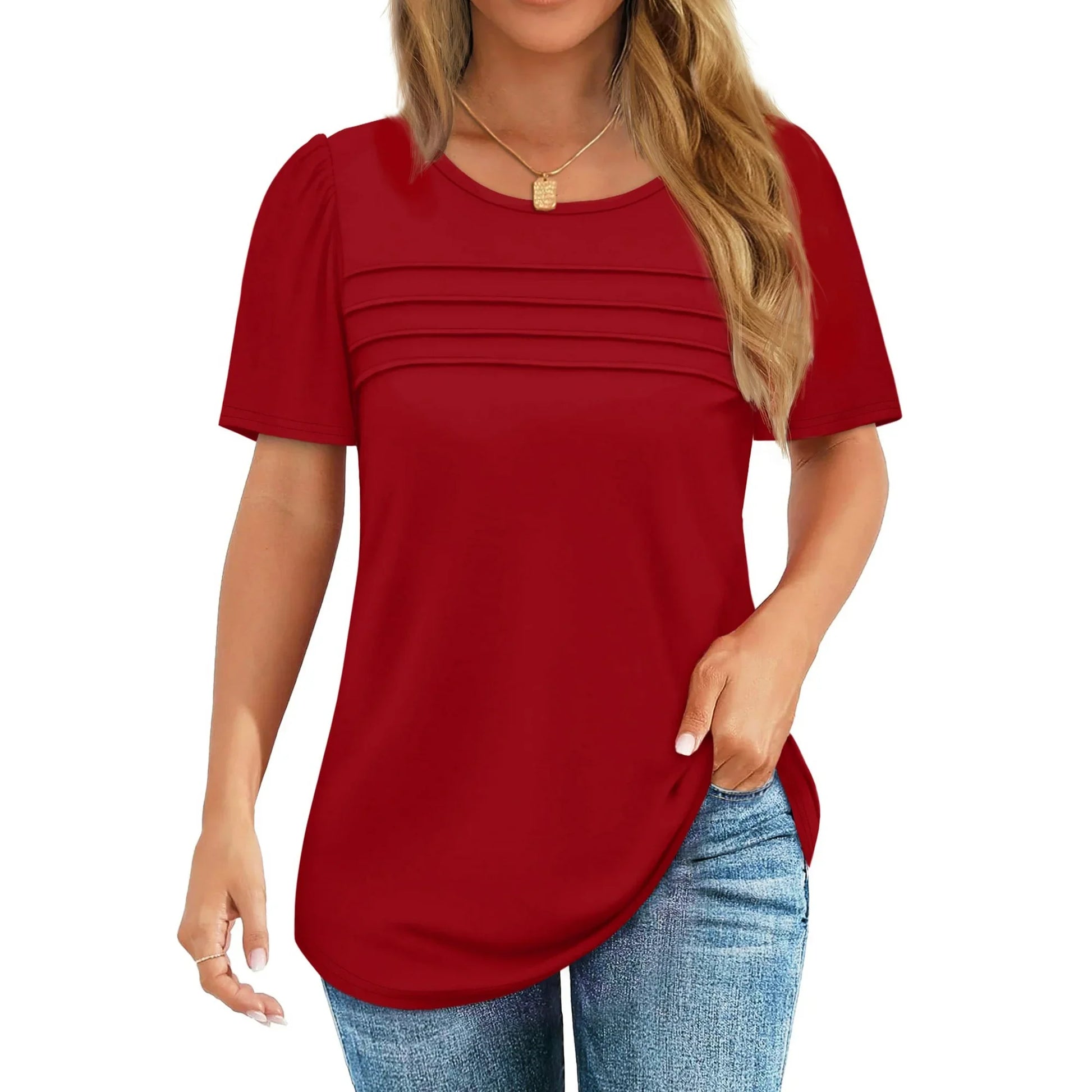 Fantaslook Women Blouses Dressy Casual Summer Short Sleeve Shirts Crew Neck Pleated Tunic Tops