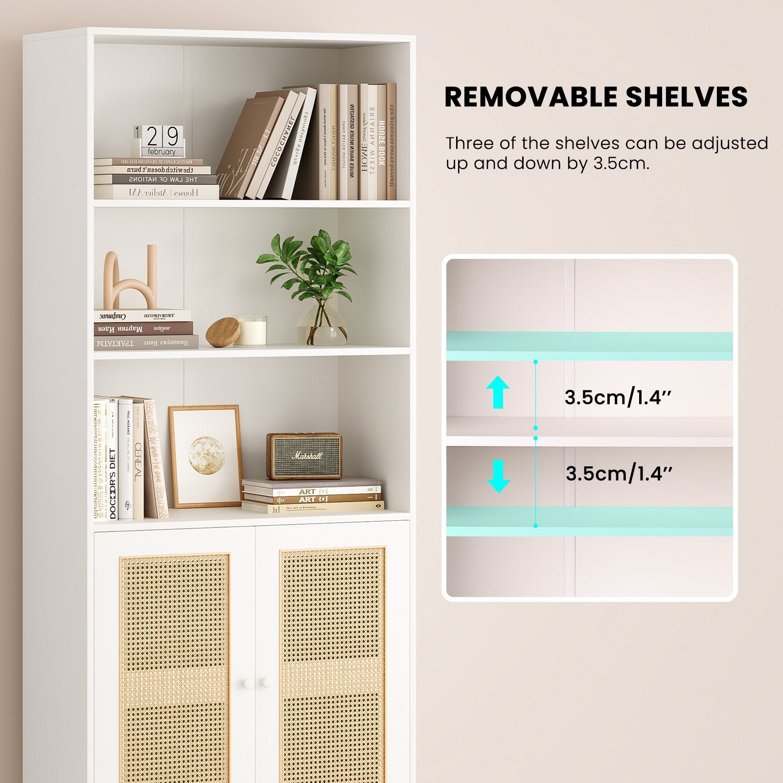 Farini Tall 5 Tier Bookcase, Storage Shelf with Rattan Doors for Living Room, Office, Library, White