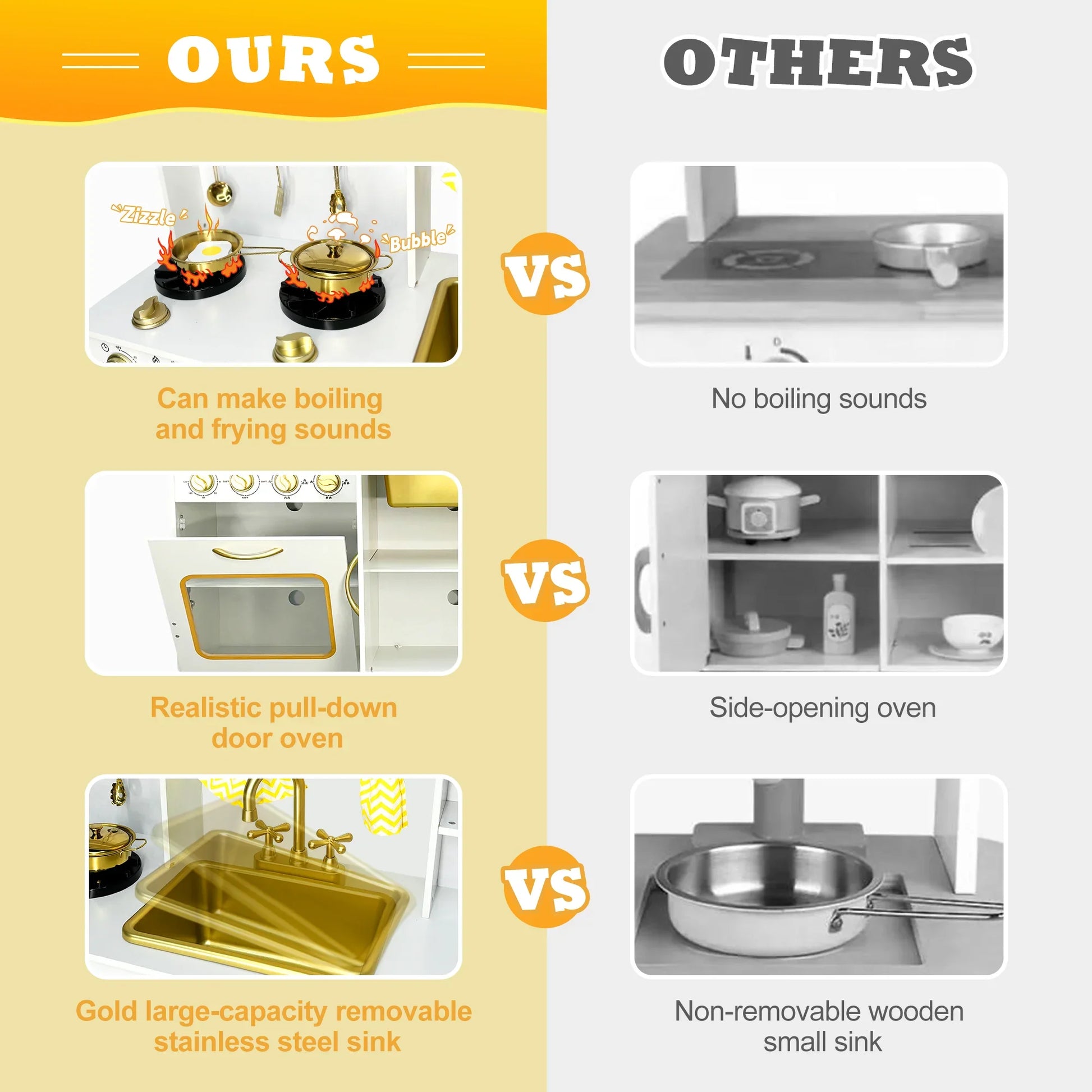 Step into a world of culinary fun with this extra-large kitchen playset, perfect for little chefs who love to cook with friends! Big enough for 3 kids to play together, this play kitchen is packed with all the features your toddlers need for endless role-playing fun. Spin the clock, check the weather, and get cooking with the dual stovetops that sizzle and boil with other sound effects! The pull-down oven door adds a realistic twist (because who needs those side-opening toy ovens?). Add some style with beautiful curtains, and let the magic of the turning faucet and gold stainless-steel sink begin—yes, it’s removable! Your little chef can also enjoy the microwave, coffee maker, large chopping area, ice maker, water dispenser, roomy cabinets, and 18 fun accessories. In addition, high-quality wood that’s resistant to mold to protect your kids' health. A chic white-and-gold or pink-and-silver design that fits any home. If you're looking for a play kitchen for your preschool kids, this kitchen set is ready to spark your kids' imagination and endless fun!