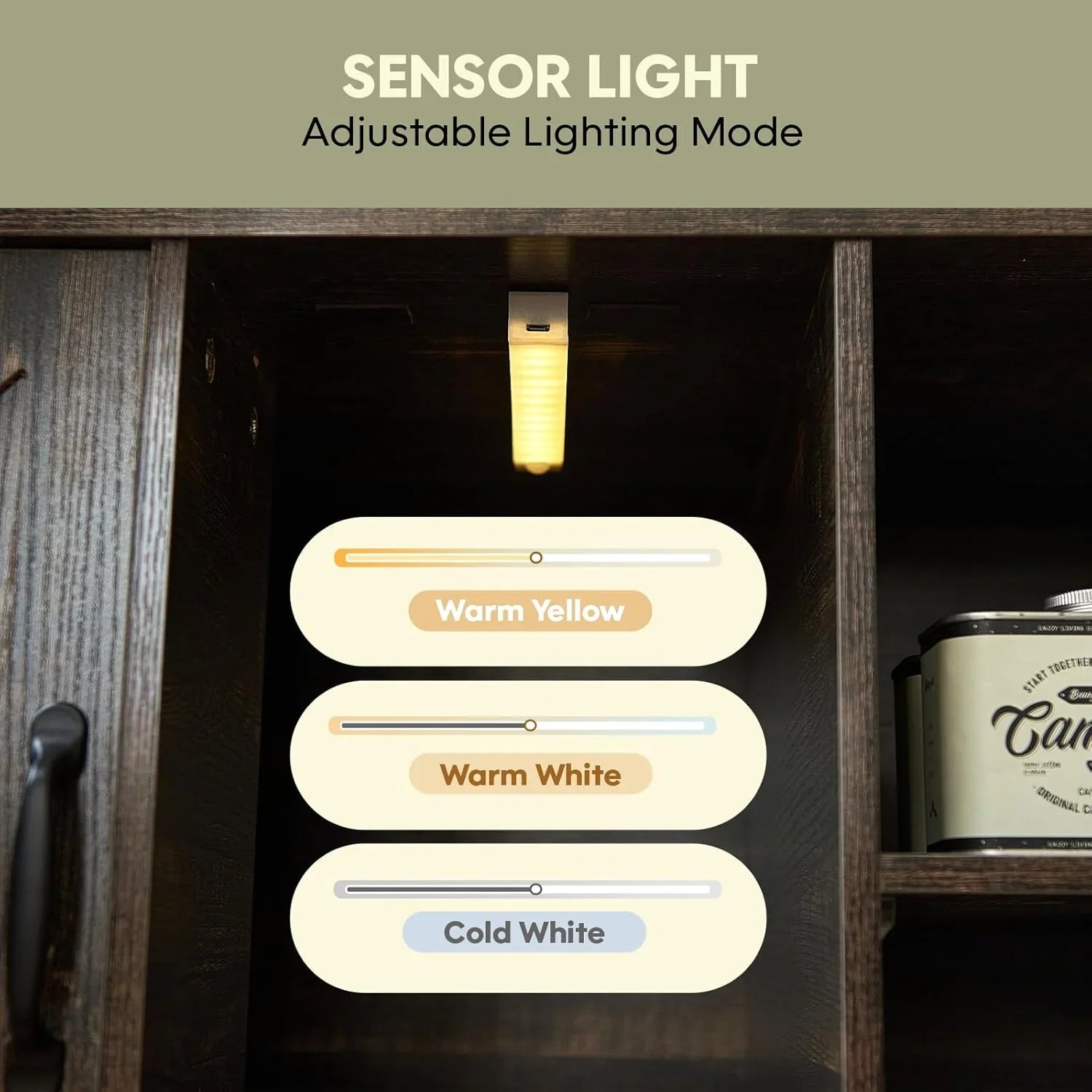 - Comes with a sensor light that you can turn on and off and adjust the brightness. The light bar has a magnetic back and may be easily attached to any furniture, or hand hold to use