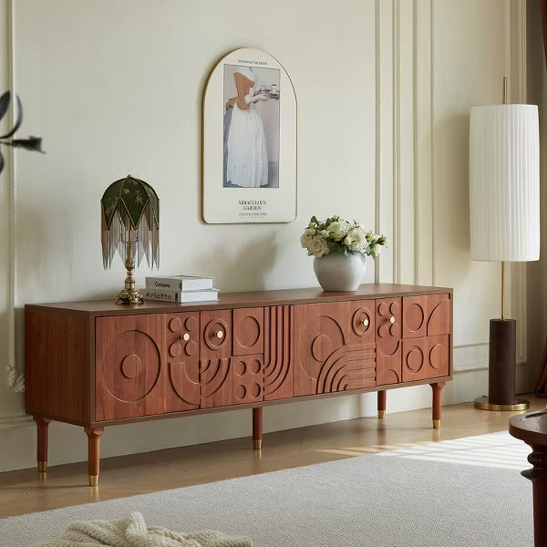 Combining artistic 3D detailing with functional 4-tier storage, this artisan-sculpted mid-century TV cabinet is crafted from durable MDF with gold-trimmed legs, blends easily into any décor, and takes less than 30 minutes to assemble