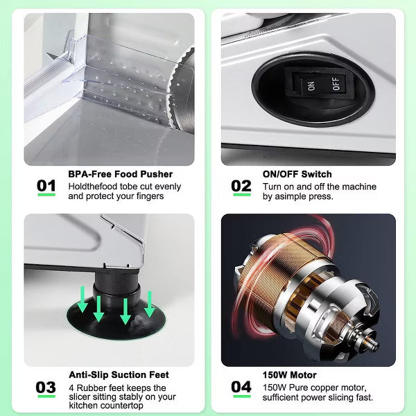 Safe Operation: The small meat slicer features non-slip suction feet to keep the deli slicer for home stable during use. The food pusher also acts as a blade guard, ensuring safe slicing in your kitchen