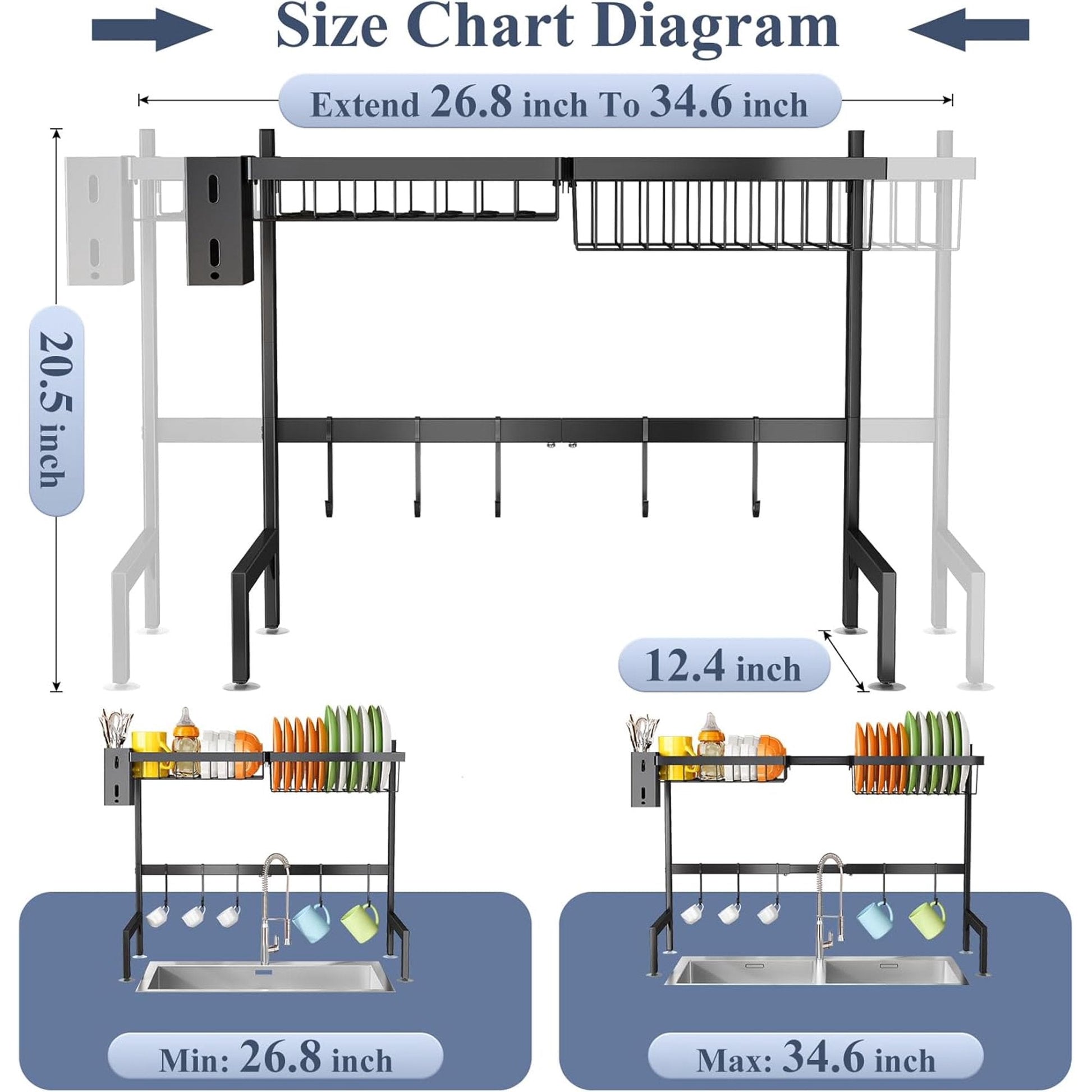 Installation and Usage: Easily install the dish drying rack over the sink with step-by-step instructions on paper. we also provide E-instructions if need. The dish drying rack extends to occupy 12.4 inches from back to front on the counter