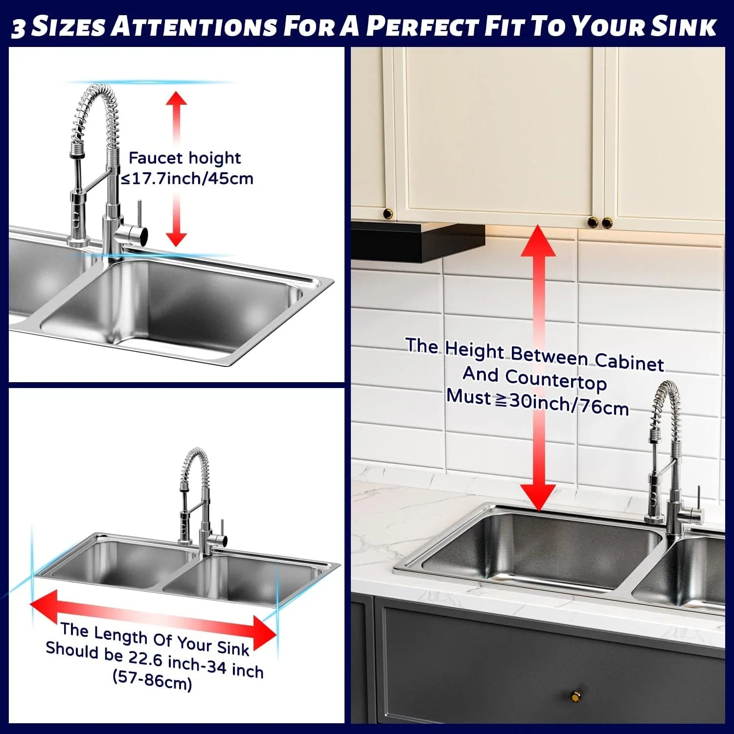 【Tips Before Purchase】Please carefully measure the length of your sink at first. Your Sink Length should be ≤34 inches and if beyond 34", please choose our other over sink dish racks. If there are cabinets over your sink, the vertical space Between Cabinet And Countertop should be at least 30 inches to place dinner plates. So please confirm your sink length and vertical space first before you order!!!