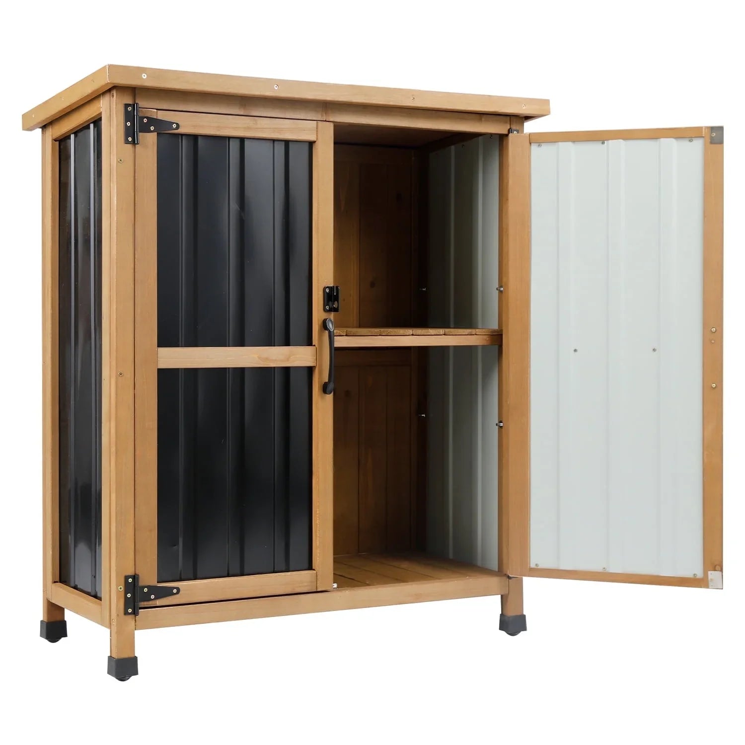 - DHybrid Construction – Combines [fir wood framework] + [metal panels] , this outdoor storage cabinet ensures long-lasting durability while withstanding outdoor elements