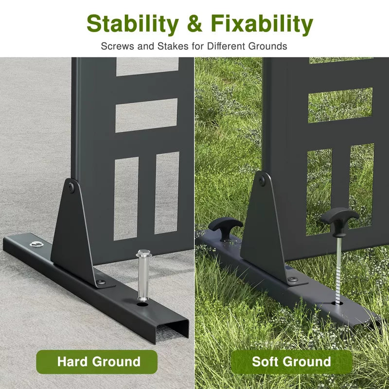 Metal Screen Divider: This tall and stylish outdoor privacy screen set with a durable stand is crafted from fully seam-welded, thick gauge powder-coated galvanized steel. The furniture-quality finish makes it resistant to scratches.