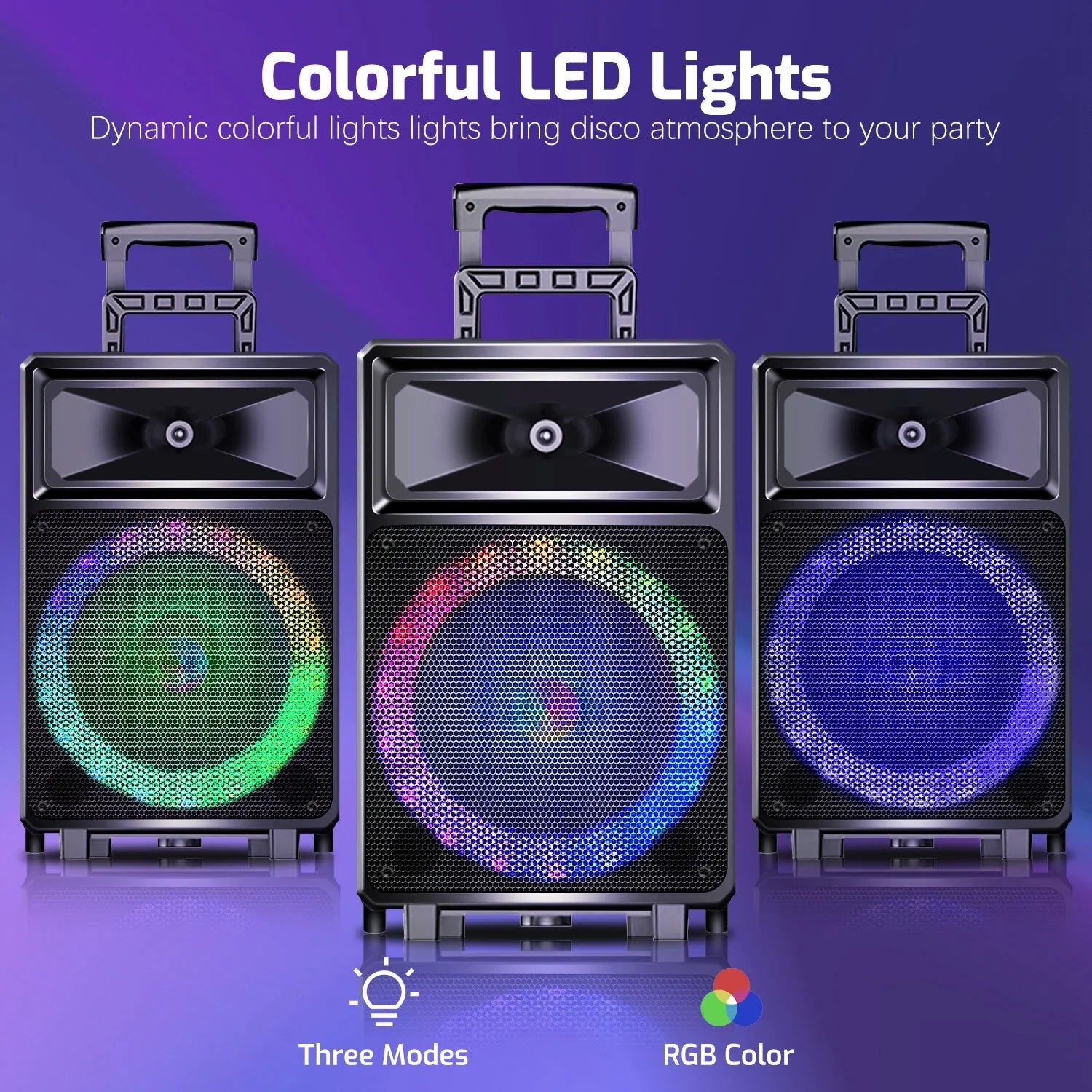 - 12" Woofer Portable PA System, Bluetooth Speaker with 2 Wireless Microphones, Dynamic Colorful LED Lights