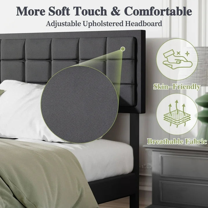 [ADJUSTABLE FABRIC UPHOLSTERED HEADBOARD] - Tailor the height of your headboard to suit your preferences and mattress thickness. The soft, fabric upholstery enhances the aesthetic appeal of your bedroom, creating a cozy and inviting atmosphere. This feature not only adds to the platform bed's visual appeal but also provides comfortable back support for reading or watching TV in bed.