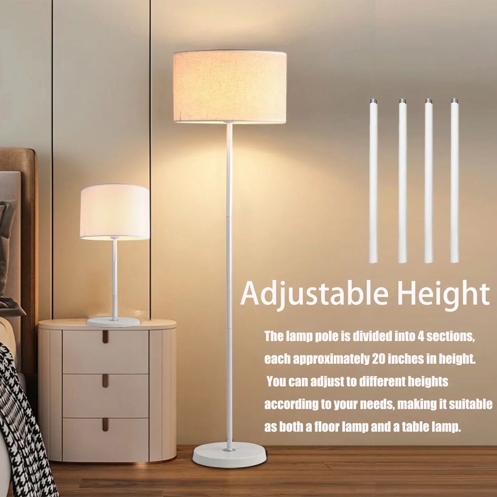 Adjustable Height: Stands tall at 60 inches, adjustable in four segments from 18 inches to 60 inches, offering versatile usage as both a floor lamp and a table lamp.