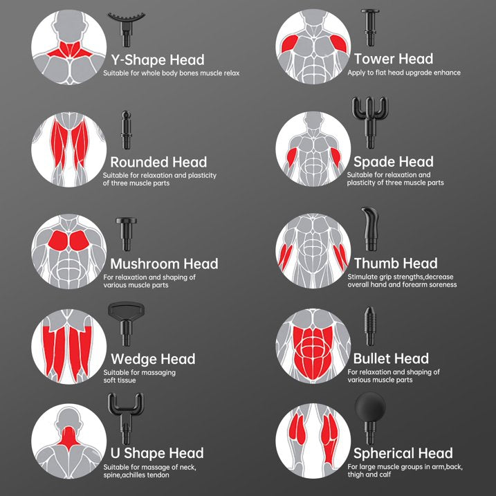 - [Multifunctional massage gun] The deep tissue massage gun has 10 different massage heads, each of which is aimed at different muscles. After the massage gun hits the muscles, it can promote blood circulation, decompose lactic acid, and relieve muscle soreness after exercise.