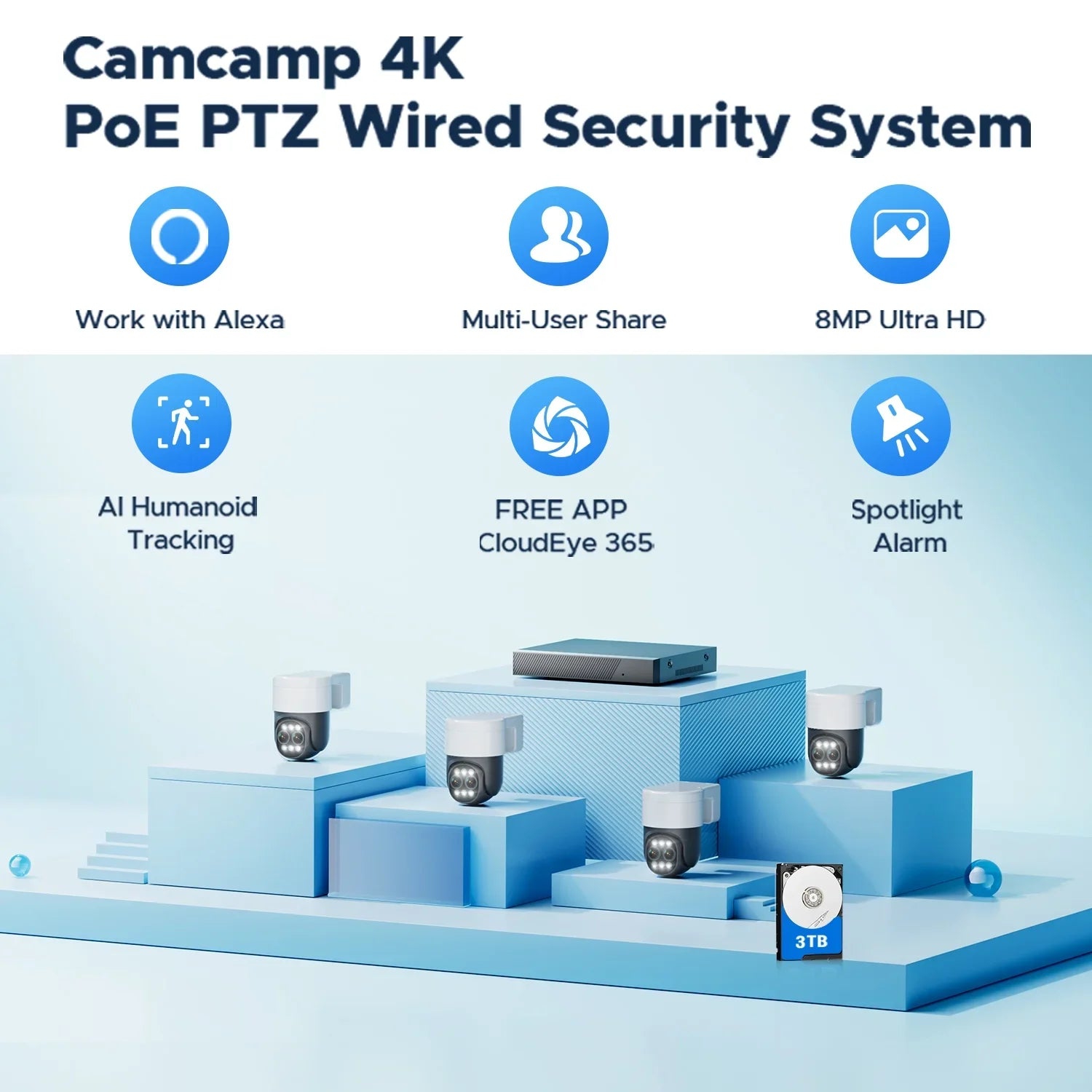 TOGUARD SC46 POE Wired Security Camera System Outdoor with 3TB Hard Drive 4K 8CH CCTV NVR 4Pcs 4MP+4MP Zoom PTZ Dome Surveillance Cameras HDMI Connector