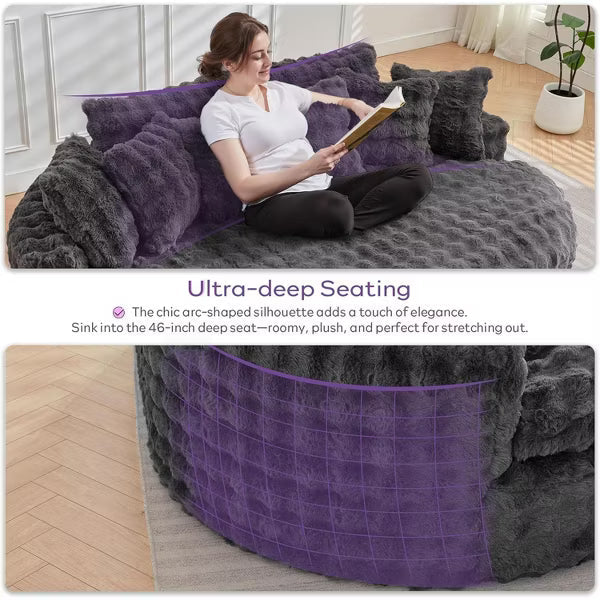 This extra-large bubble velvet sofa measures 83 inches wide and 40 inches deep, with two layers of high-density foam padding that evenly distribute weight and support the bubble velvet cloud-like surface. Carefully designed details such as the wide armrests and slightly reclined backrest perfectly complement your posture. The curved contours naturally guide you into a relaxed position, whether you're reading by the window or taking a nap on the circular sofa. It can seamlessly convert into a three-seater sofa for movie nights or instantly transform into a guest bed. The frameless design allows for quick assembly without tools, so you can relax immediately.