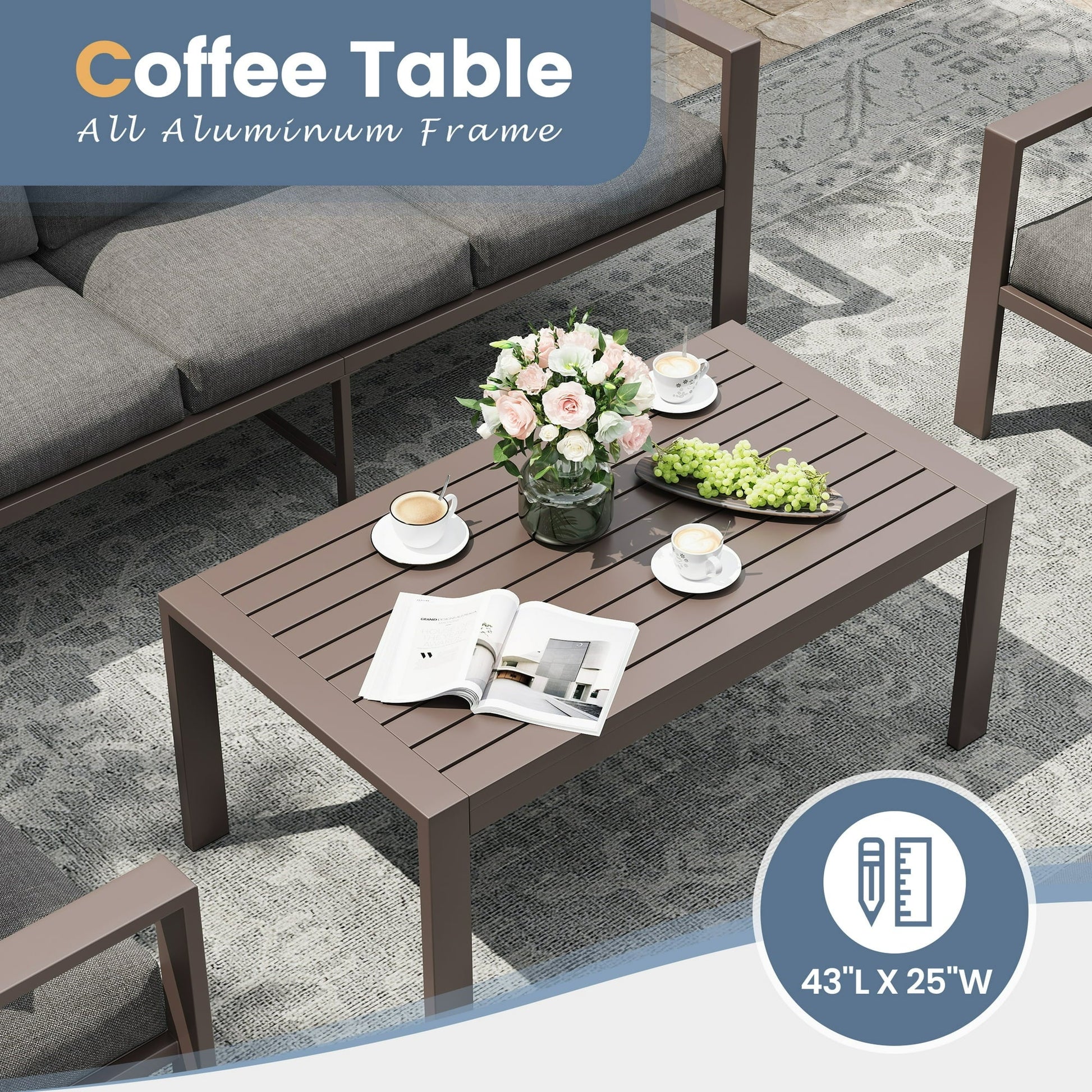 The sleek, contemporary design of this aluminum patio furniture set is sure to enhance any outdoor space. Whether you're relaxing on the patio or hosting a gathering, its sophisticated appearance blends well with various outdoor décor, adding both functionality and style to your space. -