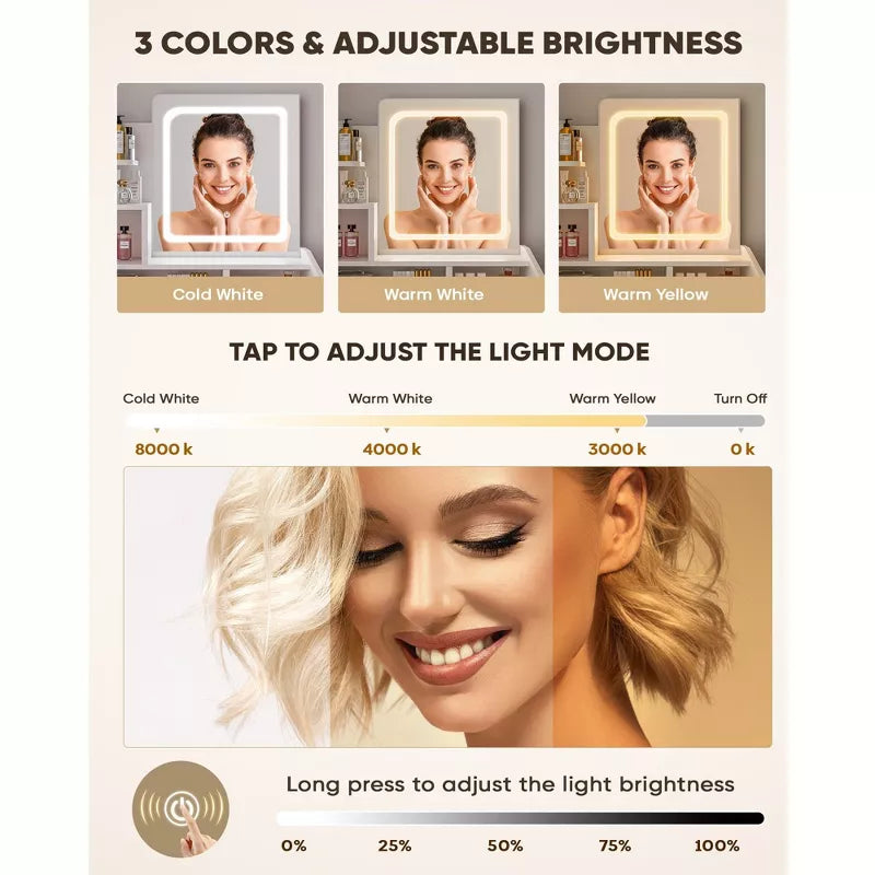 Adjustable LED & Touch Sensor Lighting:Customize your vanity experience with adjustable LED strip lights, which offer three distinct lighting modes: warm, natural, and cool. Easily adjust the brightness levels with a touch-sensitive control panel.